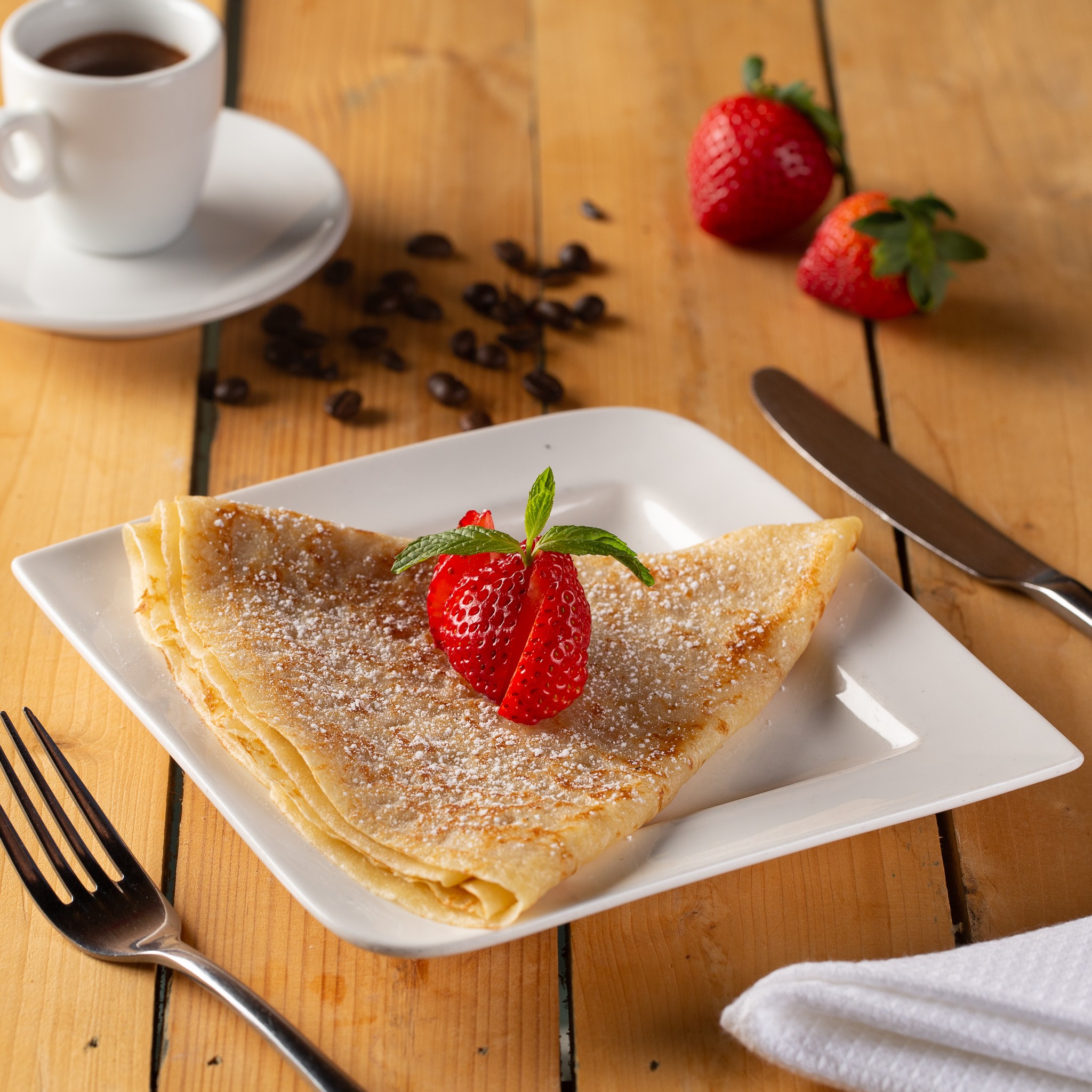 Freshly made hot crepe, served with strawberry slices and drizzled with maple syrup