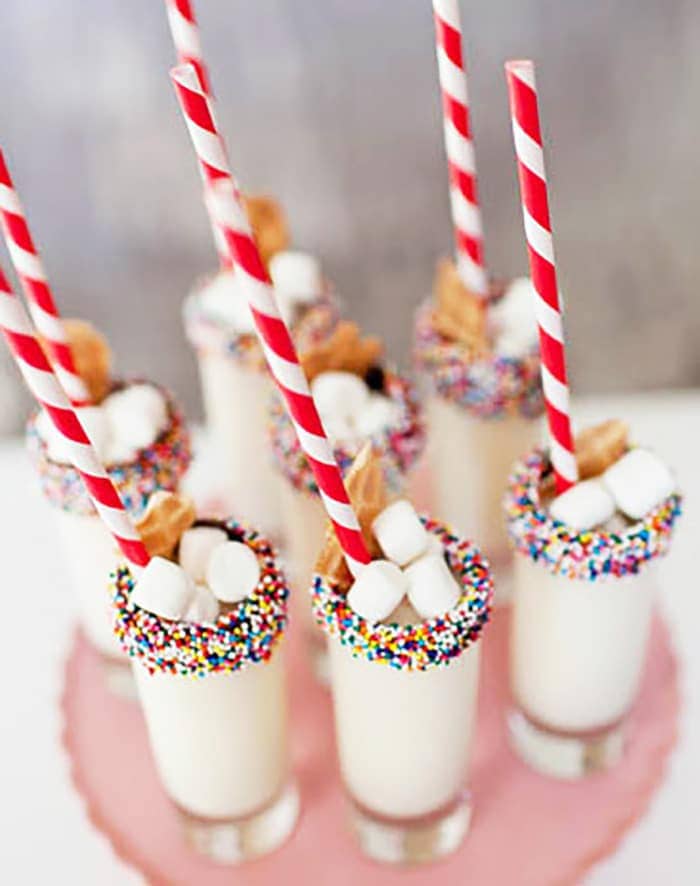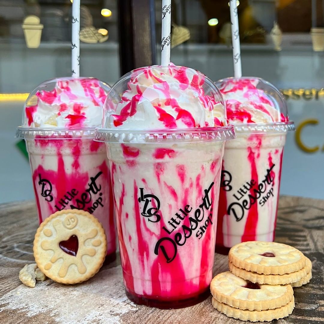 Jammie Dodger biscuits blended with Vanilla Ice-Cream & decorated with Raspberry Sauce