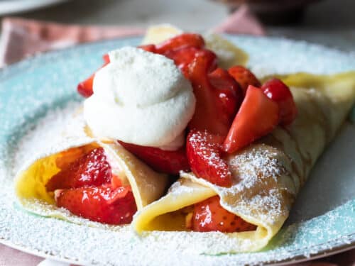 Freshly made hot Crepe, Served with Fresh Strawberry slices, Drizzled with out mouth watering Strawberry Sauce and Served with Whipped Cream and Fresh Vanilla Ice Cream