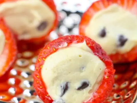 Cookie Dough covered in fresh Strawberries and Chocolate Flakes topped with Strawberry and Chocolate Sauce