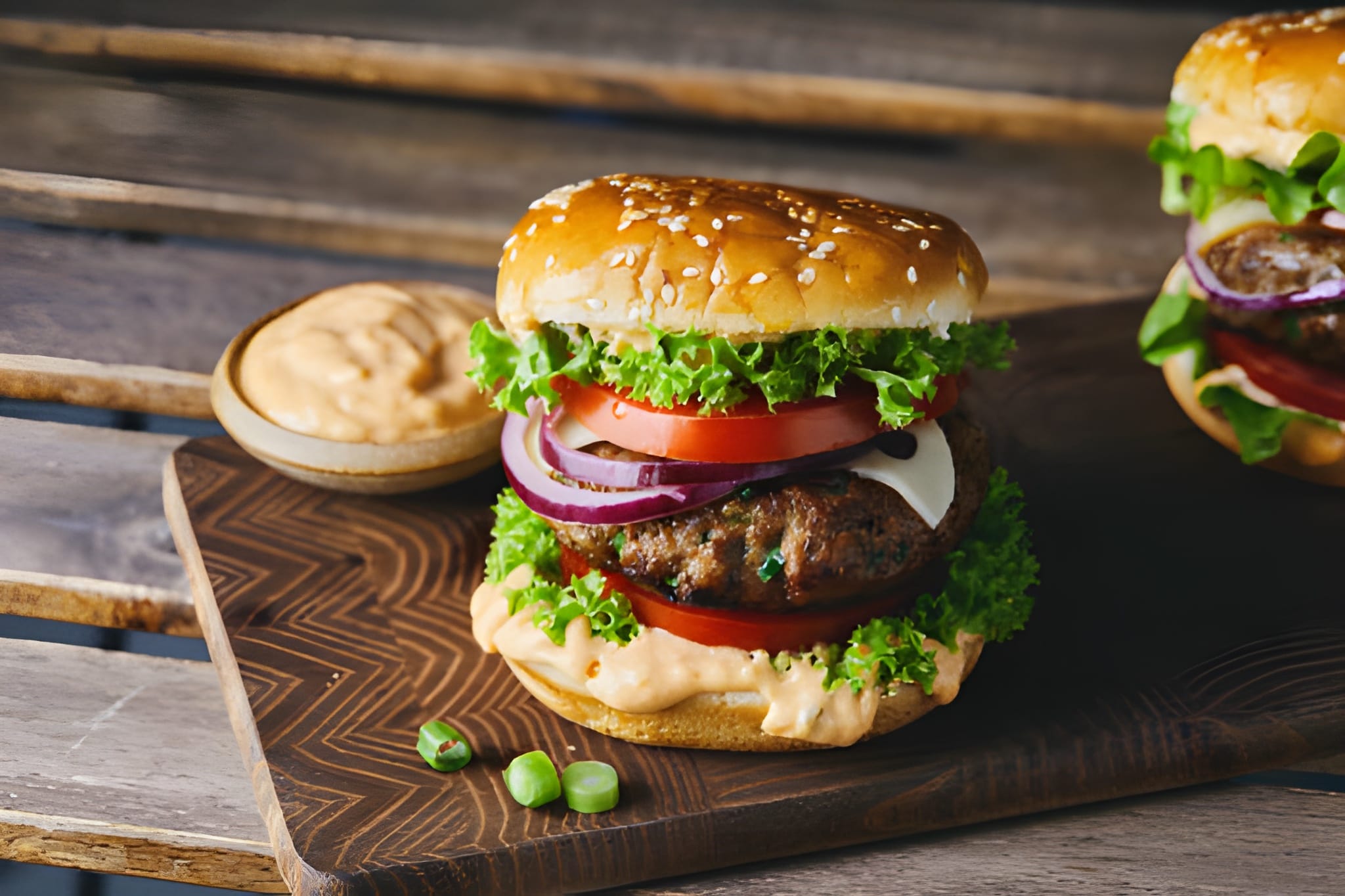 Veggie Patty, Tomato, Onion rings, Pickle, Cheese, Garlic Butter Spread on buns and our Signature Burger Sauce