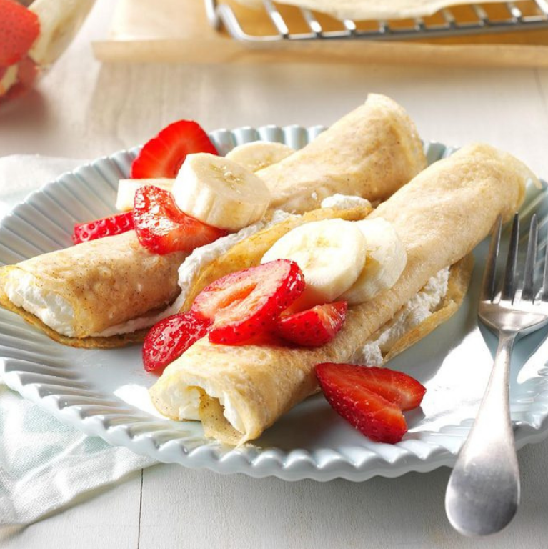 Freshly made hot Crepe, Served with Banana and Strawberry slices, Drizzled with luxurious Milk Chocolate Sauce